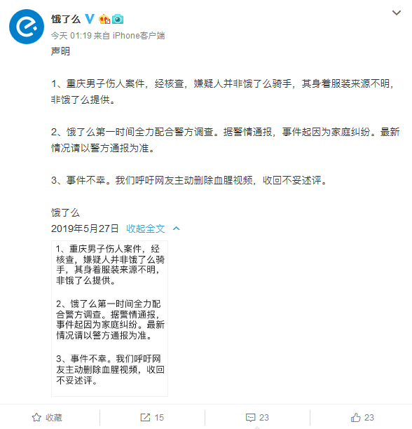 饿了么呼吁网友主动删除血腥视频,收回不妥述评。