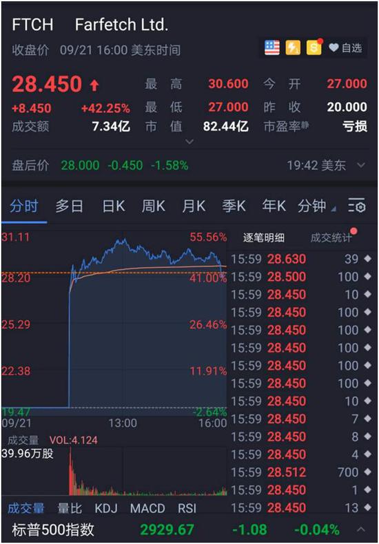 美国当地时间9月21日,英国奢侈品电商Farfetch美国纽交所挂牌上市,交易代码“FTCH”。该公司发行价20美元,交易首日竟以27美元开盘,盘中一度冲高至30.6美元,最终以28.45美元收盘,涨幅42.25%。按照当日收盘价计,Farfetch市值达82.49亿美元。