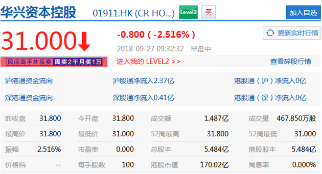 9月27日上午消息,华兴资本上市首日早盘股价小幅下跌,截至9:32,华兴资本股价报31港元,下跌0.8港元,跌幅为2.52%。