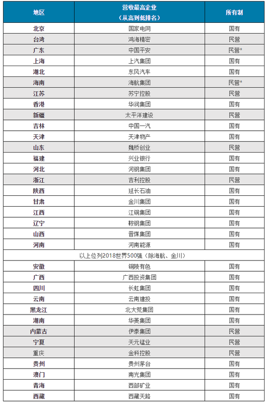 同时,如果把中国平安和海航集团算作民企,则“最大企业是民企的省份”,从2016年的11个,减少至2018年的10个: