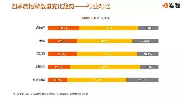 而互联网行业在调研中尚未出现目前的极度悲观预测,其中25.9%的企业表示2018年四季度会相比第三季度增加招聘需求,而表示减少招聘需求的企业占19.4%。