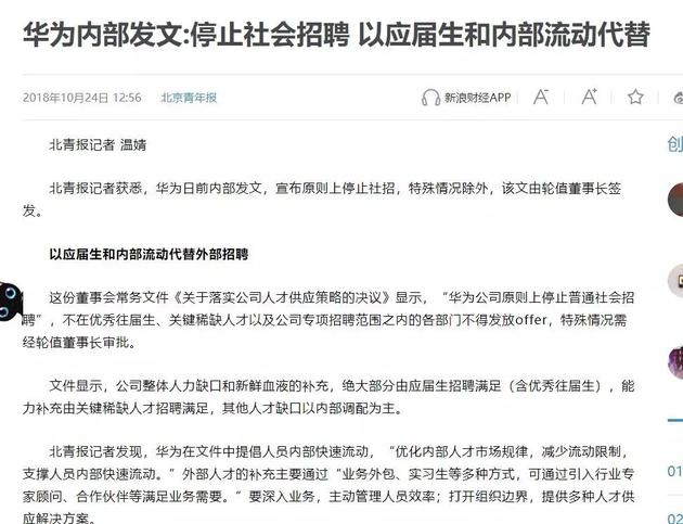 根据北京青年报报道,华为日前内部发布了《关于落实公司人才供应策略的决议》,文件显示,“华为公司原则上停止普通社会招聘”,不在优秀往届生、关键稀缺人才以及公司专项招聘范围之内的各部门不得发放offer,特殊情况需经轮值董事长审批。