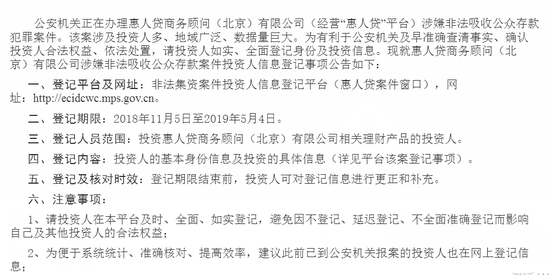 近日,公安部非法集资案件投资人信息登记平台更新了22家立案平台信息,其中,惠人贷商务顾问(北京)有限公司(经营“惠人贷”平台)涉嫌非法吸收公众存款案被警方立案。