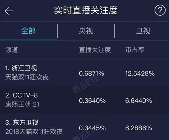 率先创造奇迹的是“猫晚”。截至10日晚23:30,浙江卫视、东方卫视《天猫双11狂欢夜》市占率超18%,其中浙江卫视以超过12%的市占率强势占据全国所有同时段播出节目内容的榜首。这意味着加上优酷的互联网全球直播,第三方收视率监测公司酷云初步估算,有超过2.4亿人收看了2018“猫晚”。