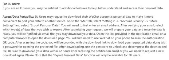 而中国互联网公司,在这方面做得还有明显差距。为了符合欧盟GDPR的要求,微信也推出了个人数据控制和输出的功能。不过,只有欧盟用户才可以使用: