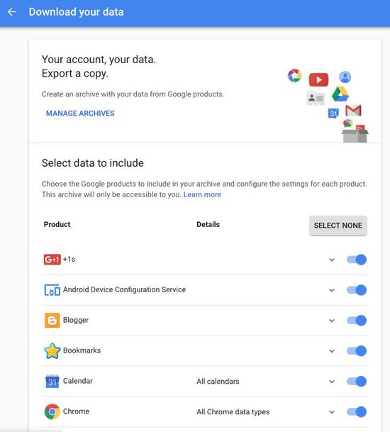 谷歌则是这方面的先行者。早在2011年,它就推出了导出个人数据的工具。现在,这个工具可以很方便地导出自己的电子邮件、照片、联系人、日历、云盘、搜索记录等等内容:https://takeout.google.com/settings/takeout