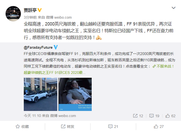 法拉第未来前CEO贾跃亭在微博转发此文,称,FF91表现优异,“全球超豪华电动车续航之王“的称号实至名归。他还在微博中提到国产特斯拉已经下线,表示FF还在奋力前行,感恩所有支持者的支持。