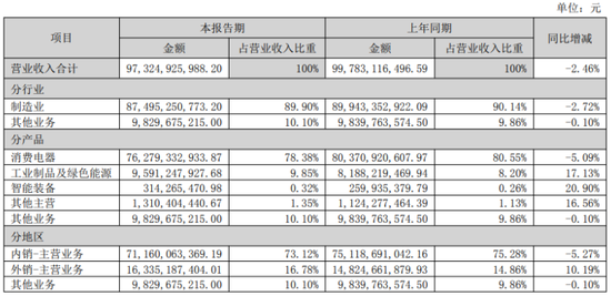从2024年年报开始,格力电器调整统计口径,主要将原“空调”与“生活电器”两大板块合并为“消费电器”。2025年上半年,格力电器消费电器实现营收762.79亿元,同比减少5%,总营收占比仍旧高达78.38%。