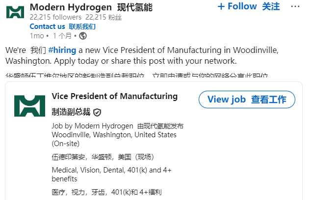 这是一家名为Modern Hydrogen的清洁能源初创公司,总部位于美国西雅图。