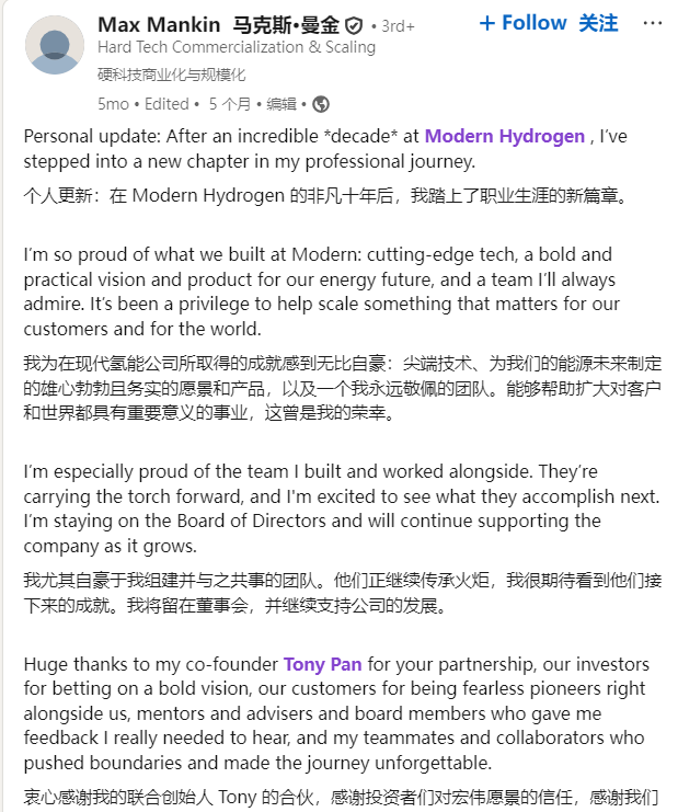 所以在Modern Hydrogen创立初期,盖茨就给予了支持,持续关注公司动向,后来领投了1亿美元。