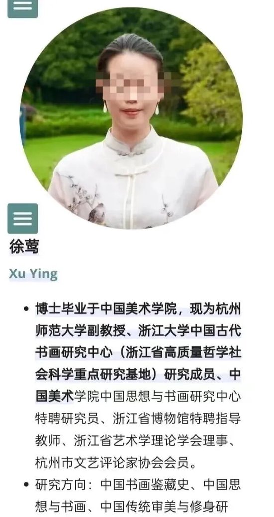 在大学的官网上,她的介绍是:博士毕业于中国美术学院,是某大学中国古代书画中心研究员。