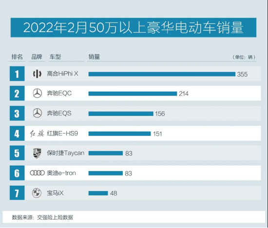 而为了营销,高合汽车还专门定制了销量榜单。比如在2022年2月,高合汽车就称,高合HiPhiX以355辆的交付量蝉联了50万以上豪华电动车的销量冠军。首先,50万元以上就把众多主流造车新势力排除在外;其次,豪华电动车, 又把BBA的燃油车排除在外。通过这两个定语,高合自然能够位居榜首。