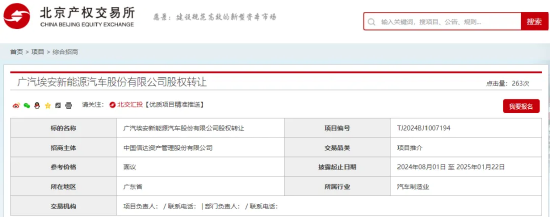 新浪科技讯 8月6日下午消息,根据北京产权交易所发布的招商文件显示,广汽集团旗下广汽埃安新能源汽车股份有限公司(简称“广汽埃安”)正推进在香港上市计划,公司计划以挂牌方式在北京产权交易所转让部分股权,招商主体为中国信达资产管理股份,但公告未有提及拟转让的股份数量或比例,期限为今年8月1日至明年1月22日。