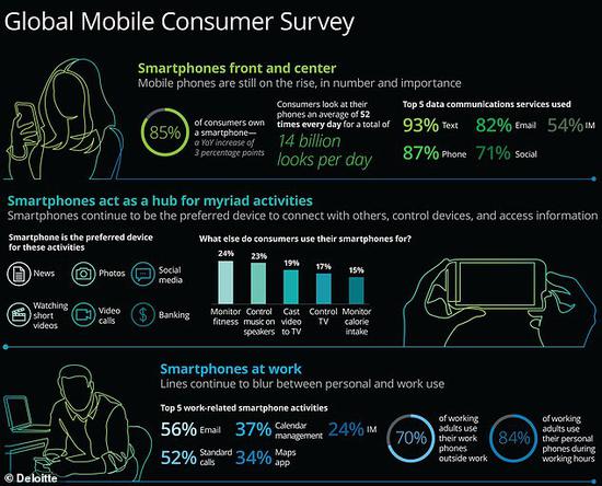 德勤副董事长、美国电信、媒体和娱乐行业负责人威斯考特(Kevin Westcott)对此称:“今年的调查确实说明智能手机已成为我们生活的核心,无论是在家里还是外出。虽然人们对语音助手和物联网等其他移动技术也很感兴趣,但智能手机仍是消费者的首选设备,让他们去做任何他们想做的事情:沟通、工作、社交、娱乐、健身或在家打理事务。”