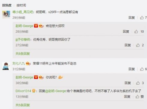 36氪讯,有网友在微博上向荣耀总裁赵明询问称:“明哥啊,V20咋一点消息都没有?”而赵明表示:“肯定憋大招呗!”另有网友留言问道:“荣耀11明年上半年能发布吗?”赵明回复道:“你说呢?”往年的惯例是华为发布Mate系列旗舰后,荣耀的V系列都会马上跟进。
