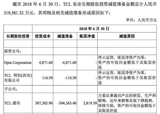 在TCL实业旗下主要公司当中,已经在港股私有化成功的手机企业TCL通讯很可能是亏损最多的一家。2017年12月31日,TCL实业根据减值测试对TCL通讯的长期股权投资计提减值准备,金额为30.45亿元。“于2018年6月30日,管理层更新上述减值测试,认为无需进一步计提减值。”这个一次性减值是造成TCL实业负资产,从而交易价格为负数的关键因素。