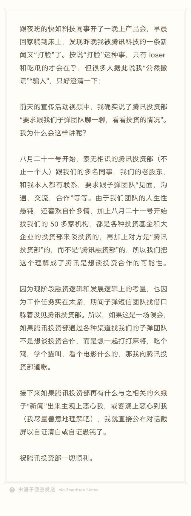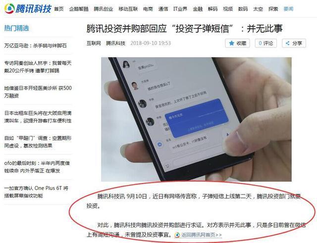 9月10日,腾讯科技发文《腾讯投资并购部回应“投资子弹短信”:并无此事》