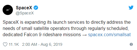 SpaceX表示:“作为发射合作伙伴,我司可为小型卫星制造商提供业内领先的专属服务,其成本仅为传统任务的九牛一毛”。
