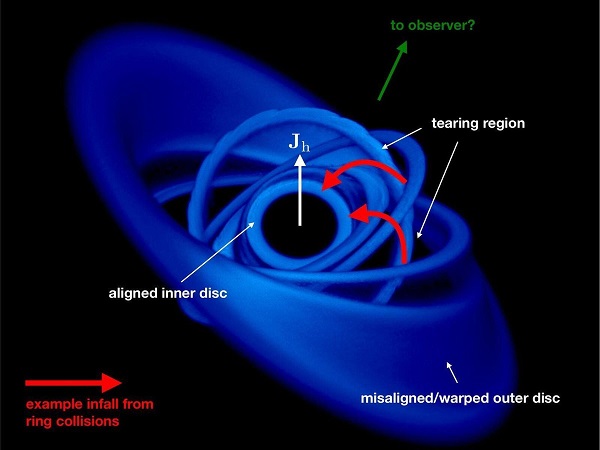 天文学家认为这些流入气体的圆盘彼此对齐,就像太阳系中黄道上的行星一样。但情况并非总是如此。气体和尘埃的云可以从任何方向落入黑洞,所以这些吸积盘真的没有理由不会错位。问题是,未对准的光盘如何影响气体进入黑洞?